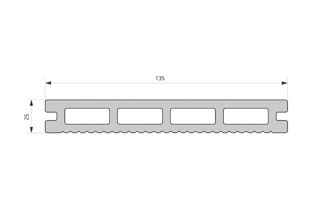 Террасная доска CM Decking Natur 135x25 это двухсторонняя доска из ПНД. Имеет две рабочие поверхности — с одной стороны брашированное тиснение под дерево, с обратной стороны узкий брашированный вельвет.